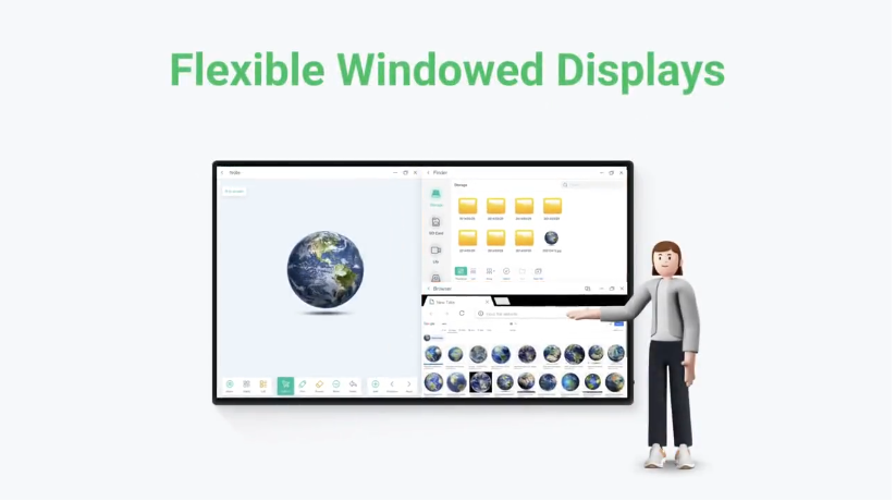 Genişletilmiş Ekran özelliği, büyük alanlar için tasarlanmıştır; yan yana veya üçlü ekran kurulumlarında uygulamaları üç farklı ekran arasında taşıyabilir ve yönetebilirsiniz. Eğitim, sunum veya toplantı alanlarınızda üstün bir multimedya çalışma alanı oluşturmanızı sağlar.