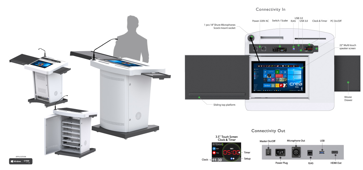 Çok amaçlı bağlantı panelleri, kontrol panelinden güç desteği, harici projektör ve ekran aygıtlarına ve ses sistemlerine erişim olanağı sağlar. Hoparlörler, sesleri gelişmiş mikrofon aracılığıyla daha hassas bir şekilde iletebilir. Platformdaki ekstra alanlar tablet ve aksesuar yerleştirmek için uygundur.