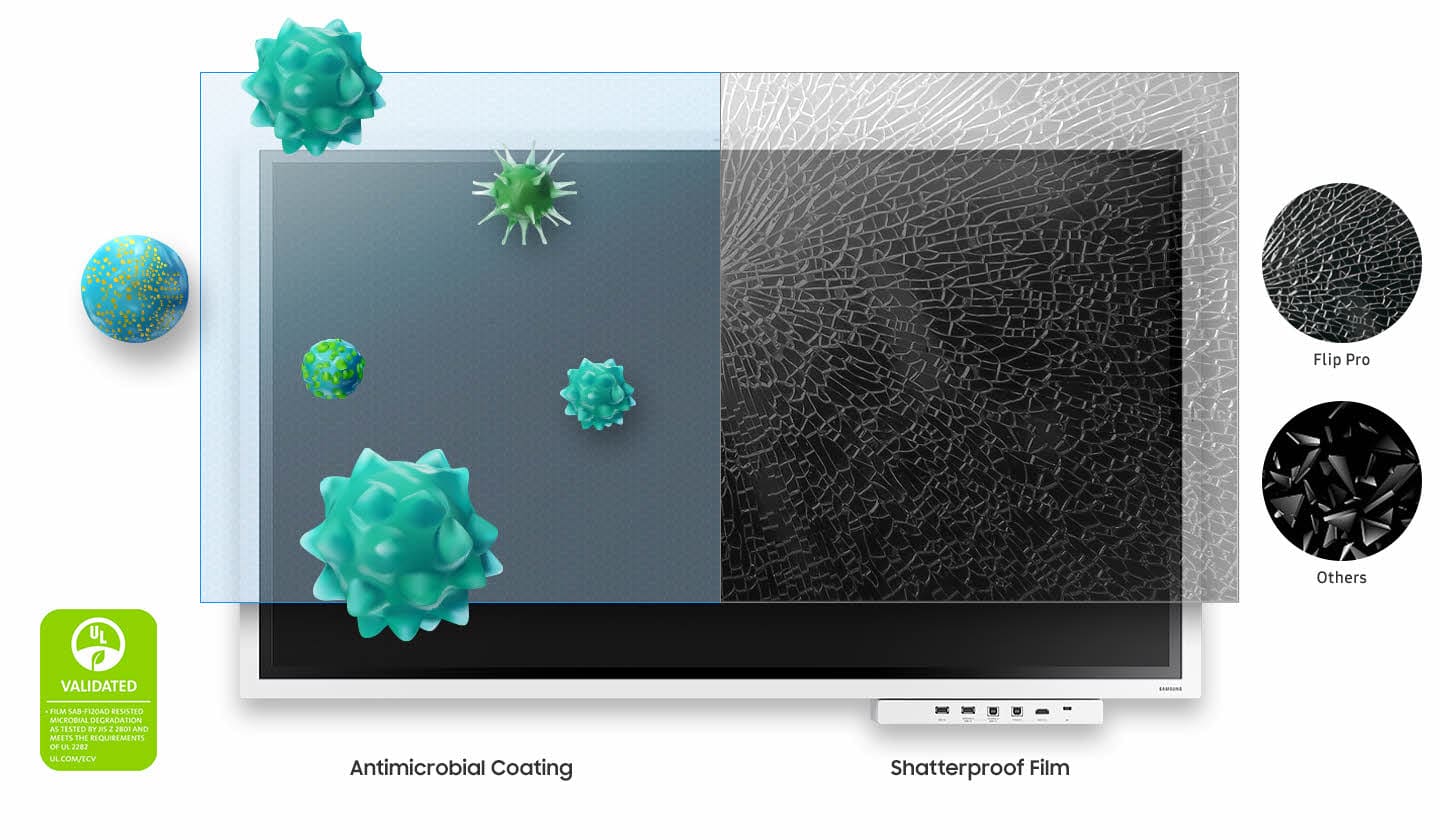 Samsung Flip Pro, mikrobiyal büyümeyi engelleyen yerleşik bir Antimikrobiyal Kaplama ile gönül rahatlığı sağlar. Ayrıca, Flip’in ekranı, kırılma durumunda ekranın sağlam kalmasını sağlamak için özel bir kırılmaz filmle sarılır.